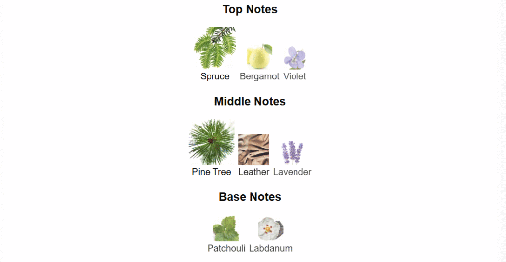 • Scent Profile: Green, aromatic pine and spruce opening with a rugged leather and lavender heart, anchored by a rich patchouli-labdanum base.