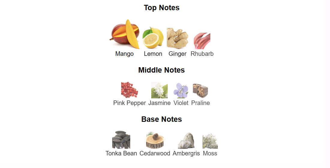 - Top Notes: Mango, Lemon, Ginger, Rhubarb (Zesty, Exotic Fruit).