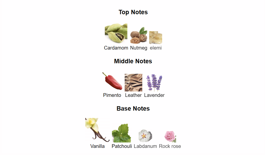 • Middle Notes: Pimento, Lavandin, Leather (Aromatic, Smoky Heart).