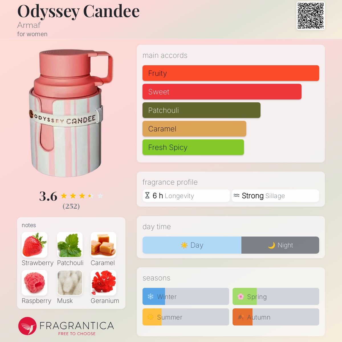 The dry-down is a sensual, long-lasting finale of earthy comfort. A sophisticated spine of Patchouli anchors the composition, while clean Musk and golden Amber (or Ambergris) leave a smooth, “second-skin” warmth. This foundation ensures a versatile performance, remaining playful enough for daytime wear while possessing enough depth for high-energy social gatherings. Odyssey Candee is the ultimate modern “sweetheart” scent—perfect for Spring and Summer, casual social events, and daily wear, signifying a presence that is consistently bright, inviting, and undeniably delicious.