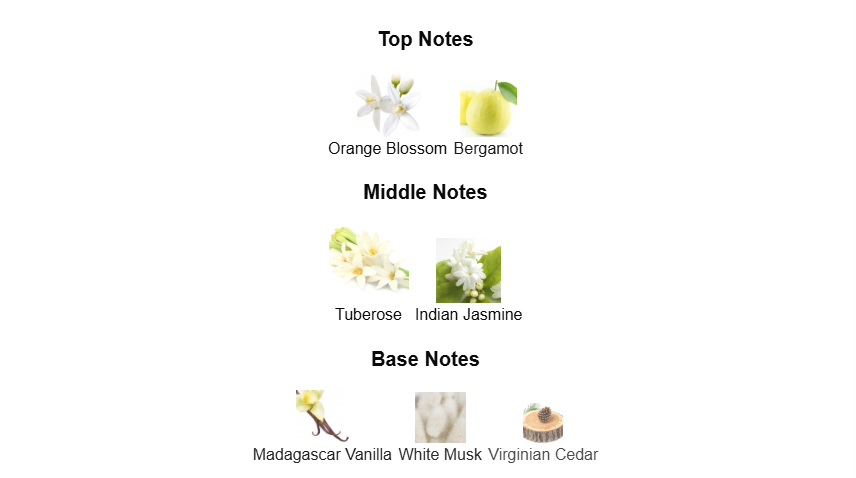 - Middle Notes: Indian Tuberose, Jasmine (Creamy White Floral Heart).
