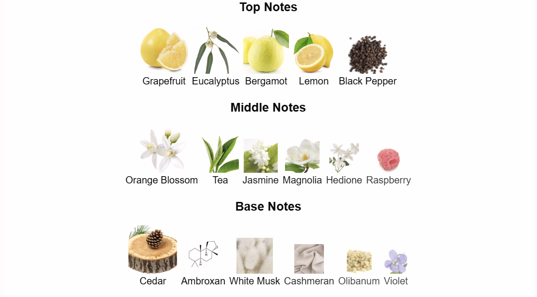 The heart of the composition is a luminous, clean floral bouquet. Delicate Orange Blossom absolute and majestic Magnolia intertwine with crisp Jasmine and a refreshing hint of Tea and sweet Raspberry. This clean floral core embodies grace and sophistication, lending the fragrance a polished femininity that remains light and airy. Hedione enhances this phase, adding a radiant, expansive freshness that makes the scent bloom around the wearer.