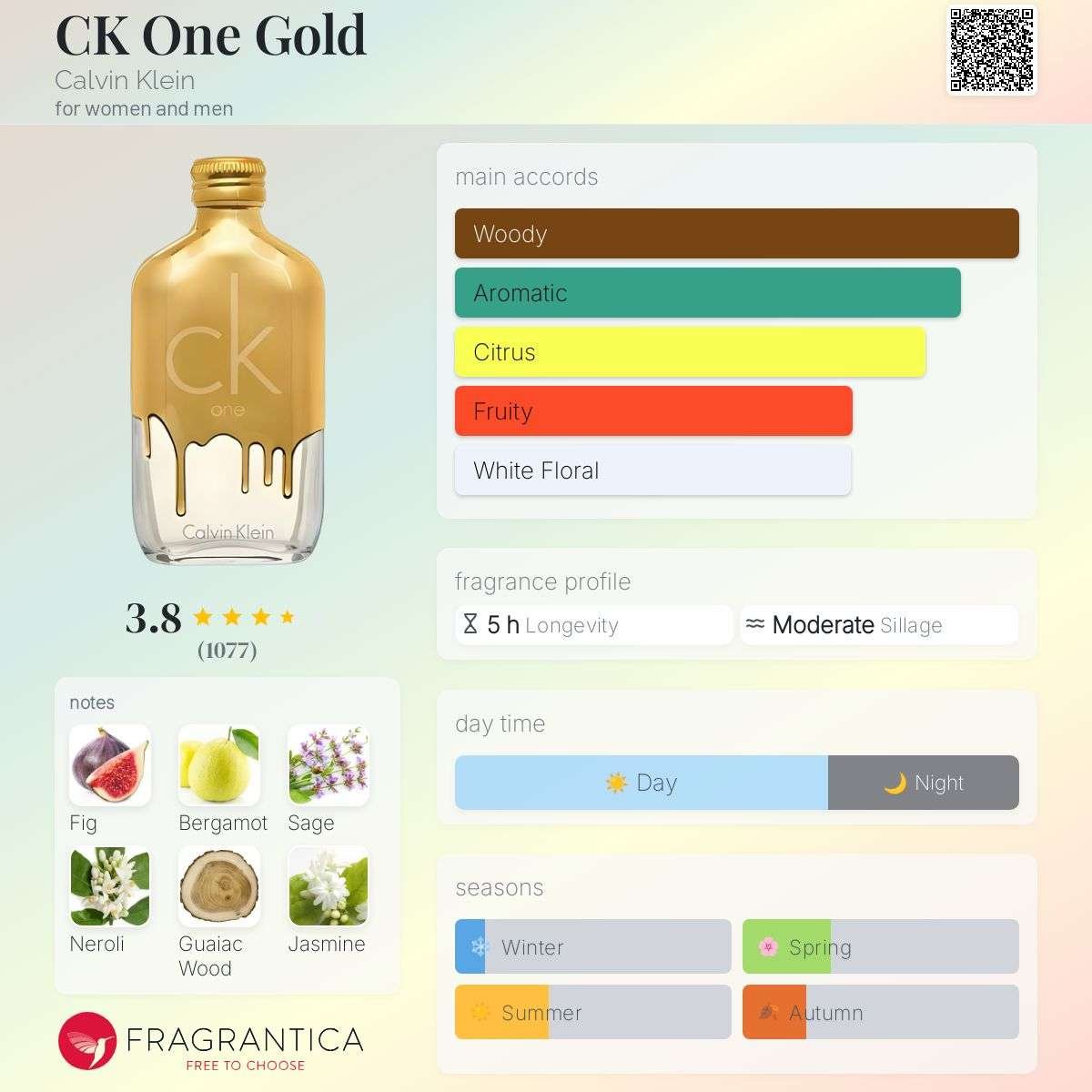 The dry-down is a sensual, earthbound finale of sun-drenched woods. Earthy Patchouli and the smoky, exotic depth of Guaiac Wood are anchored by the dry, vibrant warmth of Sunny Vetiver. This foundation leaves a comforting, intimate trail on the skin that feels both grounded and luxurious. CK One Gold is a versatile, modern essential—perfect for Spring and Summer daytime wear, or whenever you want to project a bold, liquid-gold aura of confidence.