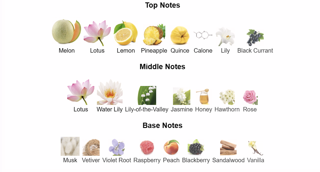 • Top Notes: Melon, Lotus, Lemon, Pineapple, Calone, Black Currant (Luminous Aquatic Fruit).