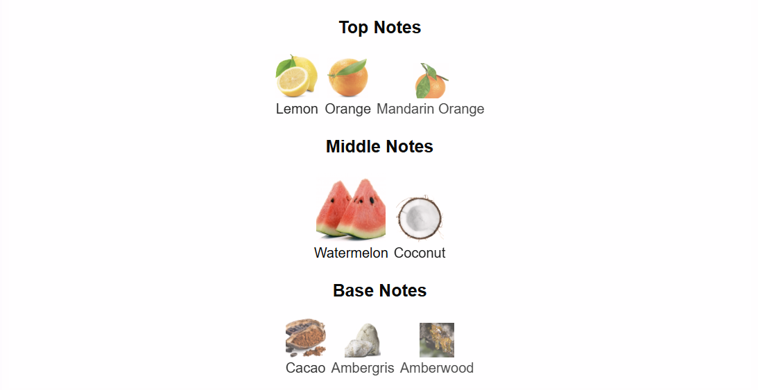 - Middle Notes: Watermelon, Coconut (Tropical, Gourmand Sweetness).
