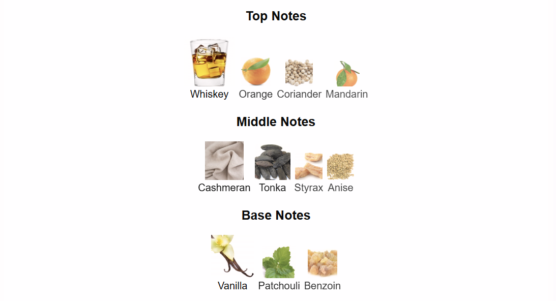 - Top Notes: Whiskey, Mandarin, Orange, Coriander, Anise (Intoxicating Spice).