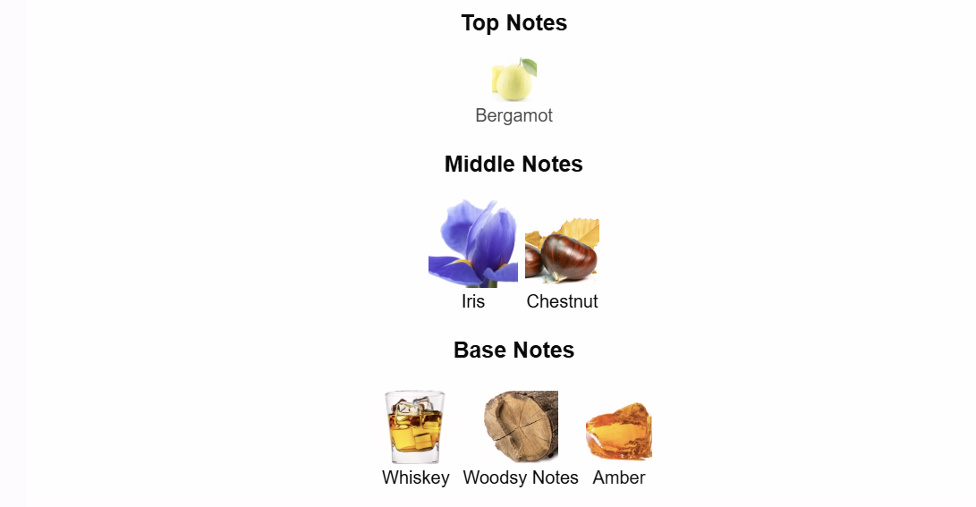 • Top Notes: Bergamot Essence, Whisky Absolute (Fresh, Boozy Spice).