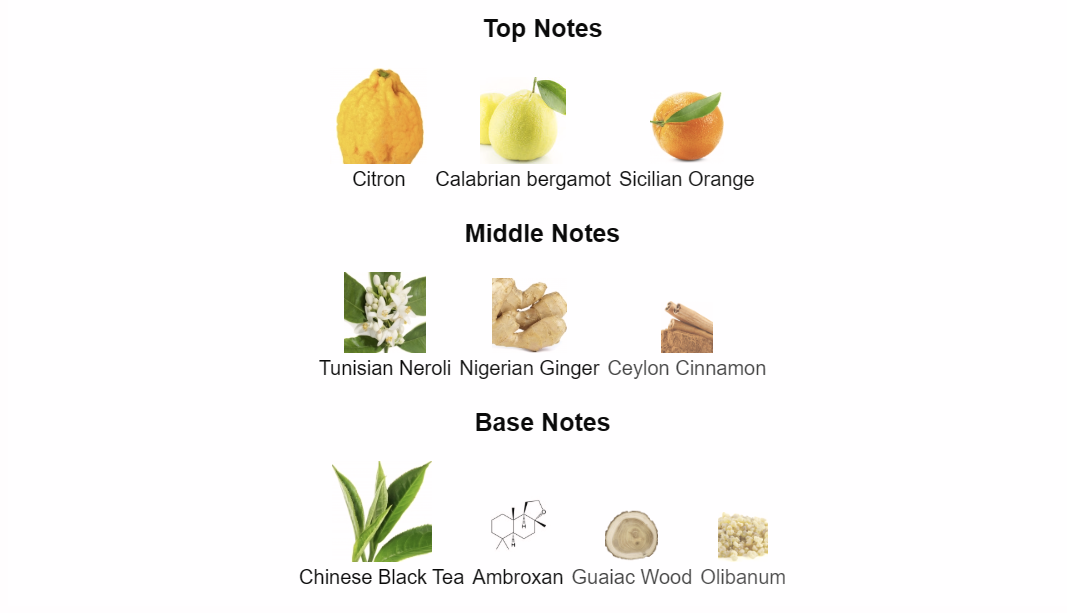 Scent Profile: Luminous citrus opening (citron, orange), a spicy aromatic heart (ginger, cinnamon, neroli), anchored by Chinese black tea and ambroxan.