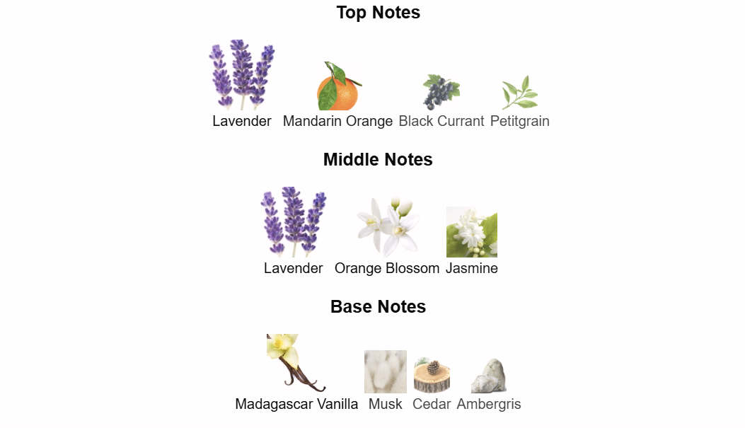 - Top Notes: Lavender, Mandarin Oil, Petitgrain, Black Currant (Aromatic, Zesty Freshness).