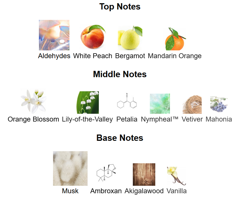 It opens with fresh, luminous notes of bergamot, mandarin, and white peach, unfolding into a heart of orange blossom, lily of the valley, and petalia. Beneath this elegance lies a sensual base of musk, ambroxan, and vetiver, leaving a powdery, skin-like trail that lingers for hours.