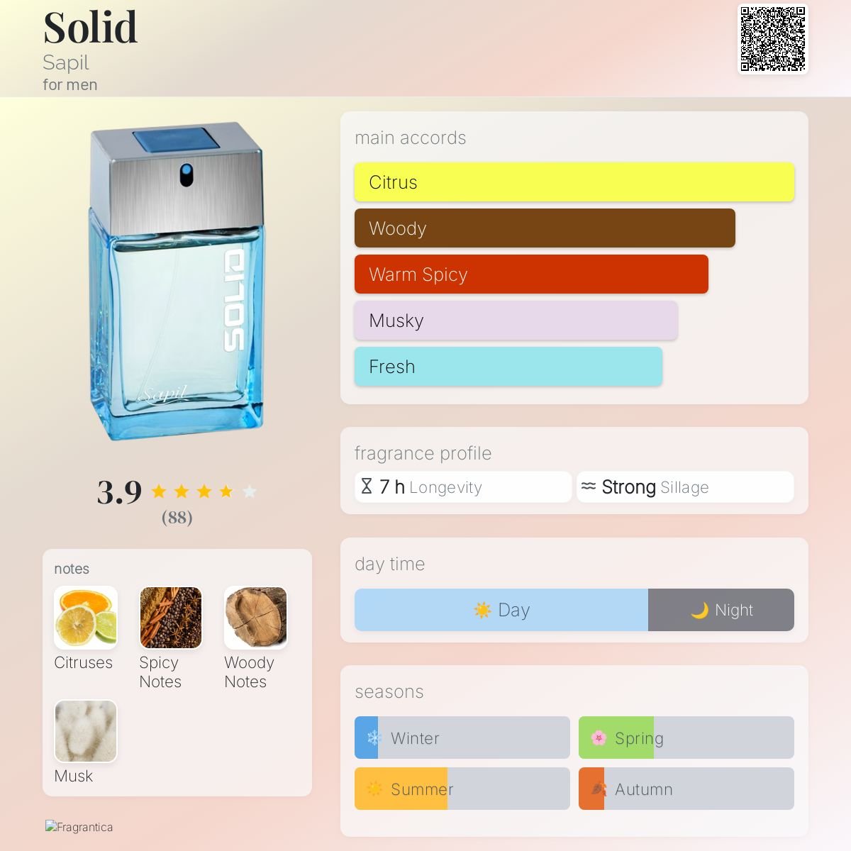 The dry-down is a sensual, mysterious finale of deep woods. Robust Woody Notes provide a solid, textured foundation, while a generous dose of Musk adds a layer of dark, exotic sensuality. This foundation ensures an enduring, “pulsating” trail that feels both sophisticated and untamed. Sapil Solid is a versatile powerhouse—perfect for Spring and Summer daytime wear, or whenever you need an explosive boost of masculine confidence.