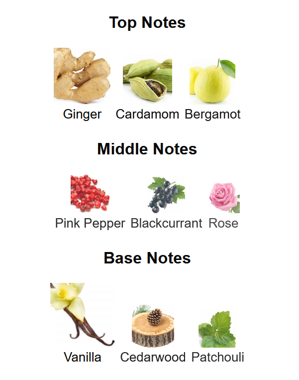 • Scent Profile: Ginger, cardamom, bergamot sparkle into a heart of pink pepper, blackcurrant, rose, finishing on vanilla, cedar, patchouli.