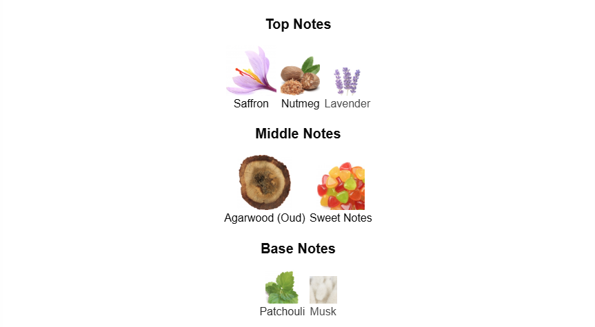 - Scent Profile: Spicy, warm saffron and aromatic nutmeg leading to a central, sweetened oud and wood core.