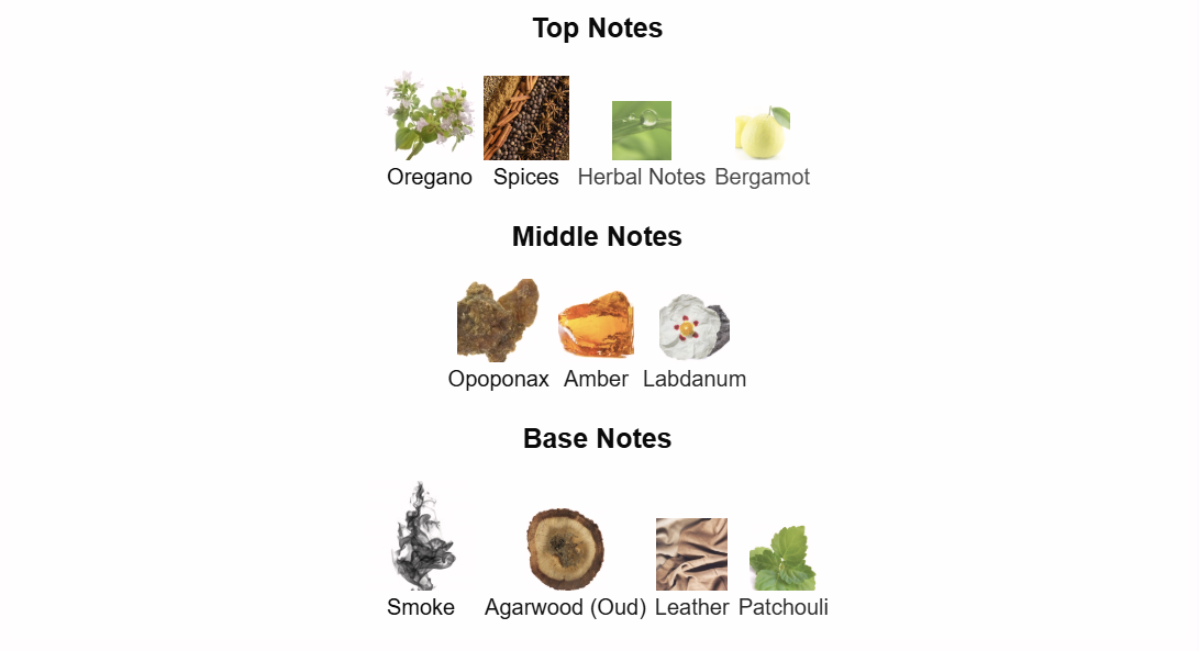 - Top Notes: Oregano, Spices, Bergamot, Herbal Notes (Aromatic and Spicy).