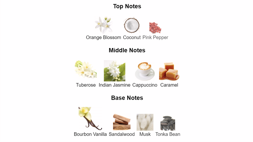 Middle Notes: Tuberose, Indian Jasmine, Cappuccino, Caramel (Gourmand, White Floral).