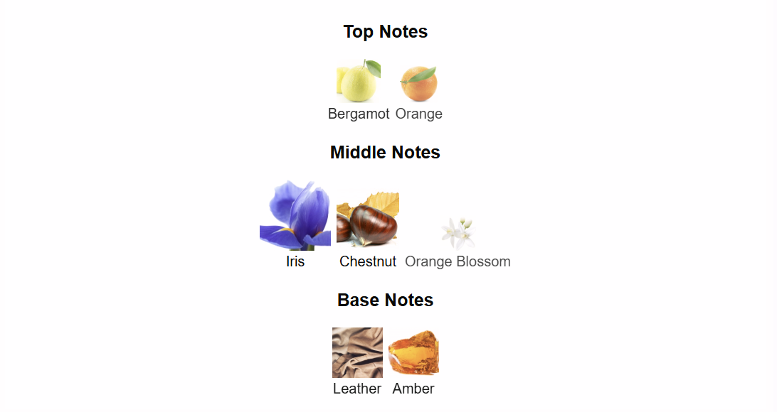 - Middle Notes: Iris, Chestnut, Orange Blossom (Powdery Floral and Gourmand Nut).